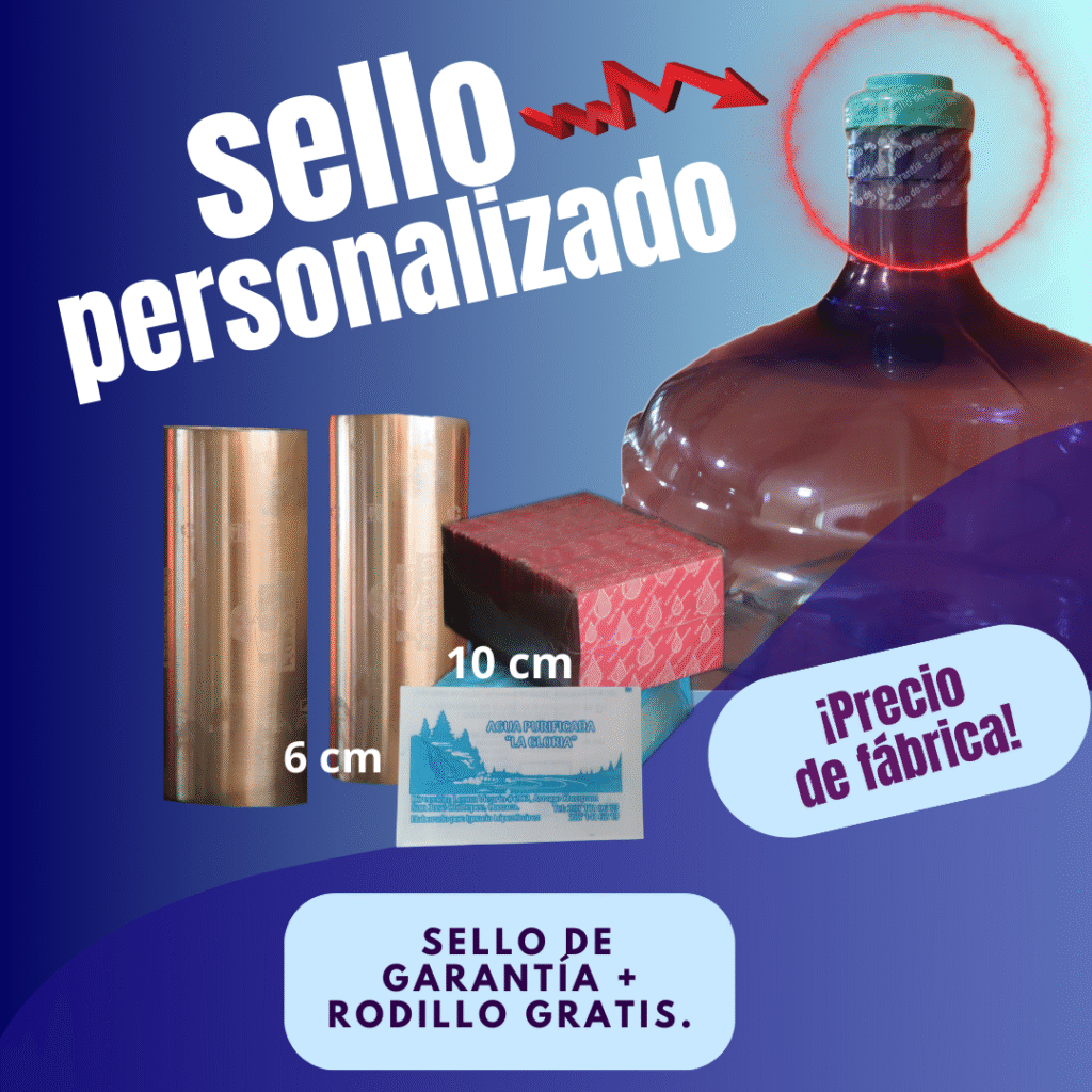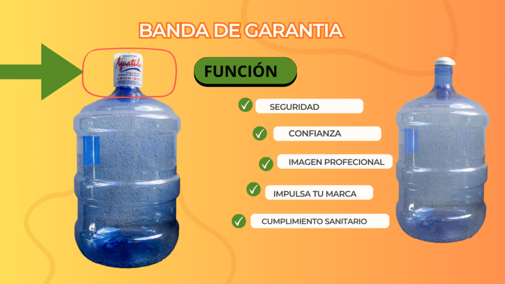 El sello de garantía es una banda de seguridad termoencogible que se coloca en la boquilla del garrafón después del llenado y tapado. Su función es proteger el agua contra cualquier manipulación y demostrar que el producto llega intacto al consumidor.